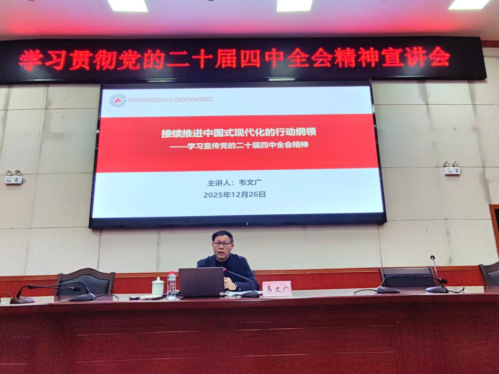 韦文广围绕党的二十届四中全会精神展开系统解读。其一,结合国际国内形势,全面分析全会召开的时代背景,深刻阐明全会在新发展阶段推进中国式现代化的战略考量;其二,聚焦《中共中央关于制定国民经济和社会发展第十五个五年规划的建议》核心内容,深入阐释“十五五”时期我国经济社会发展的总体目标、重点任务与重要举措,助力师生精准把握党中央战略部署;其三,立足高校实际,就贯彻落实全会精神提出明确要求,强调要坚持党的全面领导,将学习成果转化为推动教育教学、艺术创作和人才培养的实际成效。