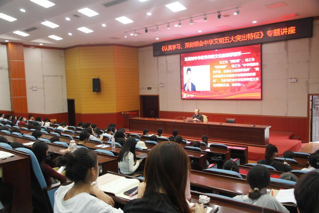 银建军教授围绕习近平总书记在文化传承发展座谈会上关于文化强国建设的重要讲话精神,结合自身经历,用丰富的案例和生动的语言深刻阐述了习近平总书记提出的中华文明连续性、创新性、统一性、包容性和和平性等五大突出特征。他指出,只有全面深入了解中华文明历史,深刻把握中华文明的突出特性,才能更有效地推动中华优秀传统文化创造性转化和创新性发展,建设中华民族现代文明。他希望同学们坚定文化自信,传承红色基因,提高自身的人文素养和审美能力,自觉学习中华优秀传统文化,为实现中华民族伟大复兴贡献青春力量。