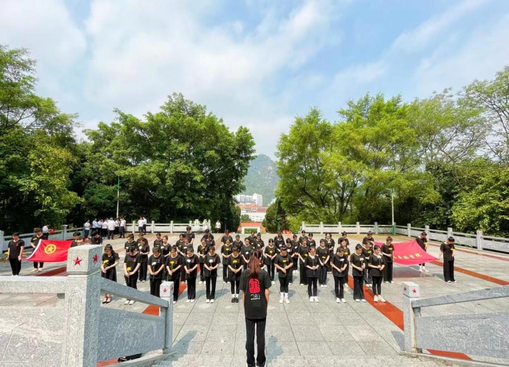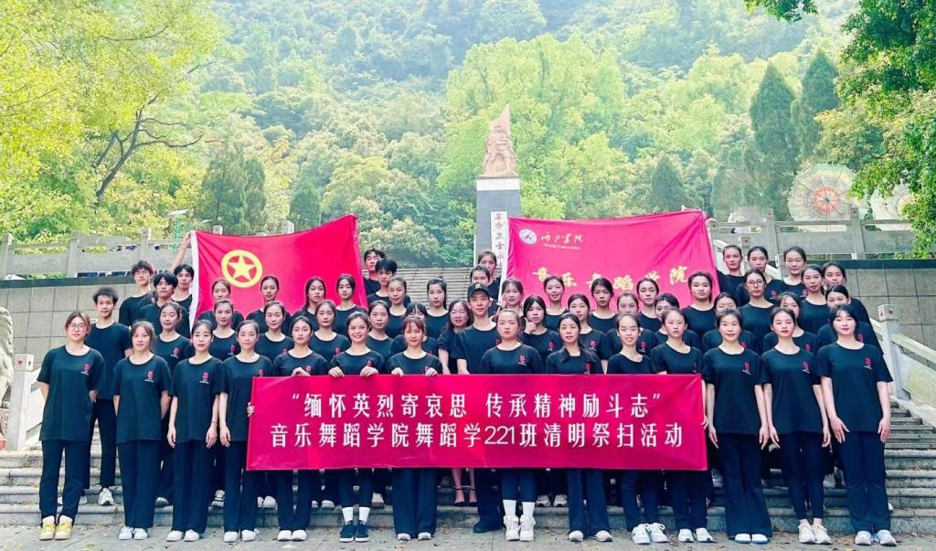 活动在庄严的《中华人民共和国国歌》声中拉开序幕。在革命烈士纪念碑前,全体人员齐唱中华人民共和国国歌。国歌唱毕,全体默哀。学院辅导员覃山福老师和舞蹈学221班班主任何昱璋老师上前整理缎带,扶正挽联。随后同学们结合自己的专业特长,全场齐唱《七律·长征》,用歌声表达对先烈的追思和对祖国的热爱。