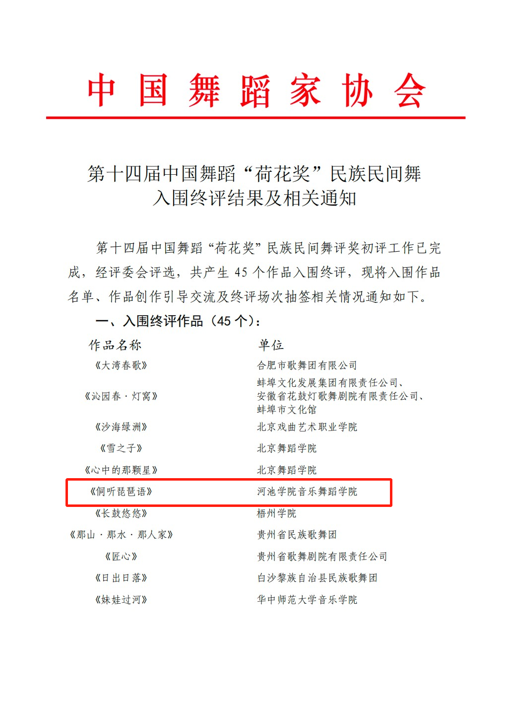 近日,第十四届中国舞蹈“荷花奖”民族民间舞评奖公布了45个入围终评作品名单,我校betway必威西汉姆联原创舞蹈作品《侗听琵琶语》成功入选终评作品名单中。这是我校舞蹈学专业建设的一个重大突破,具有非凡的里程碑意义。