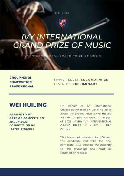 近日,我院青年教师韦慧玲在第九届常青藤国际音乐大赛(THE 9th IVY INTERNATIONAL GRAND PRIZE OF MUSIC)作曲比赛中荣获中国区作曲专业组二等奖,并直接晋级全球总决赛,拟于8月在美国华盛顿进行总决赛。
